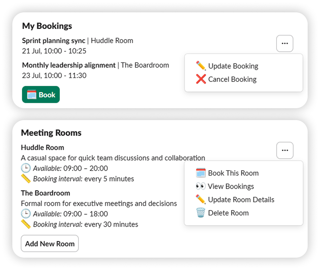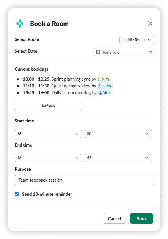 After installing the app, add your meeting rooms, and your team can start booking immediately. To book a room, simply use the /book slash command.