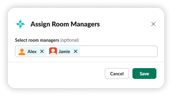 Only workspace admins can manage rooms, but they can assign room managers to share responsibilities.