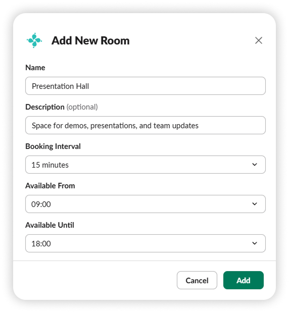 Set custom booking rules for each room, including earliest booking start time, latest end time, and booking intervals.